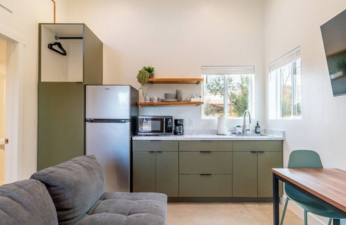 The space boasts a queen bed on the main level as well as a queen in the elevated loft. With large loft windows facing both East and South, you're sure to enjoy stargazing on a clear night. Kitchenette includes everything you'll need to enjoy a meal in or prep food to get an early start at the park. The home includes a 50" smart TV, and fiber internet.