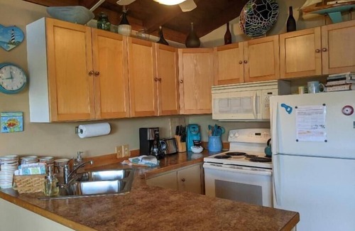 A fully outfitted kitchen - electric range, refrigerator, microwave, Keurig & regular coffee maker, plus all the pots pans dishes and flatware you'll need - sorry no dishwasher