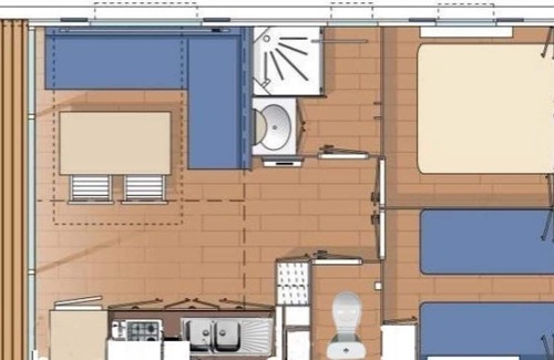 It consists of a bedroom with 140x190 bed and storage cupboards, a bedroom with 2 twin 80x190 beds. In the living room, the sofa converts to a bed for 2 people. You will appreciate the living room / stay and the kitchen open on the terrace. Shower room and separate wc. Color TV. Private parking next to the mobile home.