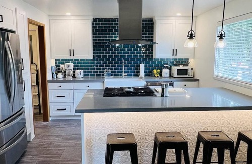 Open concept living and kitchen provides ample space to stretch out, cook and work. The home is well decorated with eclectic art and a relaxed modern bohemian vibe. The living room has couch, chairs, a dedicated work space, and a 65” TV that can be enjoyed while dining at the kitchen bar as well.