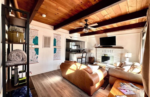Modern & centrally-located Tahoe City Ski Cabin walking distance to downtown & the nearby lakefront restaurants, bars & shops. Renovated 2 bedroom, 1 bathroom ski cabin w/ stainless steel appliances, new floor, cozy rugs & big leather couches to sit around the gas stove & smart TV. Large kitchen to cook with bright sunlight & forest views.