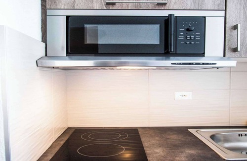 Layout: On the 6th floor: (Kitchen(stove, hob, coffee machine, combination microwave, fridge, electric hot plates, dishes and cutlery, Cooking basics, Wine glasses), bedroom(double bed, TV), bathroom(bath tub, toilet, hairdryer, shampoo, body soap, hot water))