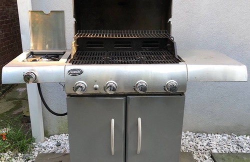 Step outside to a secluded, enclosed patio, featuring comfortable seating for four from Restoration Hardware & Crate & Barrel. Fire up the 5-burner gas grill (propane included) for a relaxing evening under the stars—perfect for dining, unwinding, or socializing.