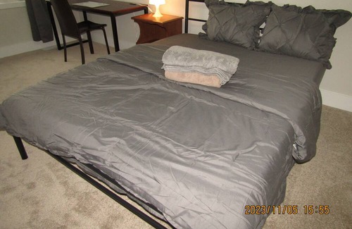 ➜Room 4: Queen-size bed with portable fan, closet, office desk, and chair with a private ensuite bathroom featuring a smart lock for added convenience.