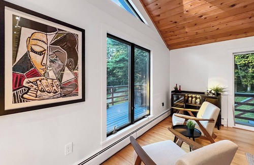 Escape to Tranquility Glade, a newly renovated modern chalet set on 5.5 private forested acres in West Stockbridge, Massachusetts — just 6 minutes drive from Tanglewood and Kripalu. The charming towns of Lenox and Great Barrington are nearby.