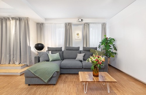 Upon entering the apartment, you'll be greeted by a bright living space with beautiful parquet floors and a natural brick wall. It is a basement apartment, every room has windows and the apartment is very bright and modern. The living room features a cozy sofa with extra blankets and pillows. A large electrically retractable screen and complimentary Netflix make the living room its own home cinema and a perfect spot for movie nights.