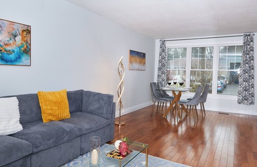 Welcome to your 1000 sq. ft. modern retreat with free parking and a private garden. This home is thoughtfully designed with a stylish interior, a spacious bathroom with shower, a sleek kitchen, and a dedicated workspace. Stay connected with high-speed Wi-Fi, enjoy movie nights on the 55" smart TV, or relax on the patio. Laundry facilities and 3 parking spots make your stay hassle-free. Located near shopping, dining, and trails, it’s the perfect mix of comfort and convenience.