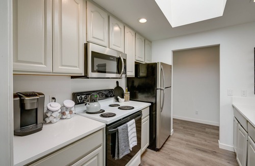 KITCHEN: Fully equipped and remodeled kitchen, 2-person breakfast bar, tile countertops, Keurig coffee maker, dishwasher, cooking basics, kitchen window