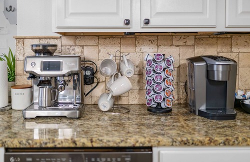 Prep and cook delicious meals in the large, well-equipped kitchen, featuring a Keurig coffee maker, toaster, microwave, gas stove, along with refrigerator, microwave, and dishwasher. You’ll appreciate the expansive counter space during meal prep. Please note that not all kitchen appliances seen in photos may be available upon arrival. Please inquire with host prior to booking to ensure specific amenity is available.