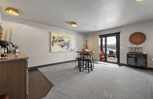 Kick back and relax in the spacious living area featuring plush seating, a sleek gas fireplace, and large windows that showcase breathtaking mountain views. The fully equipped gourmet kitchen is perfect for preparing meals, whether you're making breakfast before a day of adventure or enjoying a family dinner.