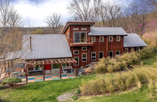This beautiful modern home in the country on 10 acres is 3,000 sq.ft. The house has 3 bedrooms, 3 bathrooms, 3 king beds & two futons. Sleep by Number bed in master and memory foam in the other bedrooms. High quality bedding with down comforters. There is a large kitchen with dining room and three 'family rooms' w/ four couches. A utility room with washer & dryer. The master suite has a large master bathroom with a 3.5'x6' tub and a double shower. TV with satellite service and wifi internet. Natural Swimming Pool great for cooling off or just relaxing nearby. Property is perfect for a family gathering or guys or gals retreat. Also would make a lovely couples romantic getaway. Enjoy the natural surroundings and unplug (or not) from daily stress. Lawrence, KS is just a 20 min drive away with plenty of sports bars and restaurants. The house is in a perfect location just 45 min from the KCI airport, 20 minutes to the University of KS in Lawrence, and 15-20 min to Legends Outlet Mall, NASCAR track, Sporting KC soccer stadium, Schlitterbahn Water Park, Cabellas, etc. There is a wood burning stove in the lower level family/living room. The house is secluded, quiet and comfortable. There are great views with beautiful sunsets. An outdoor fire pit and hiking trails are also available.