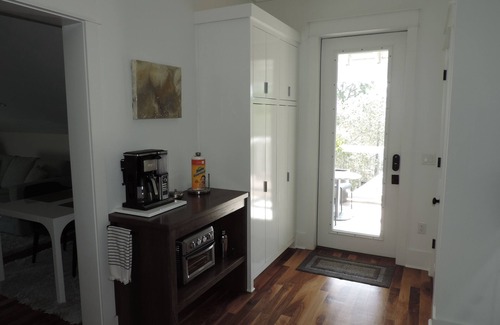A modern above garage studio apartment, located just 1.5 blocks from beautiful South Walton beaches. Walk up the stairs to a private patio & entrance into a kitchen with full fridge, stovetop, & coffee station. Large living area with wall separating sleeping area with king size bed. Two Flat screen TVs with wifi, HBO, & Netflix are in each area. Couch in living area also a queen size sleeper. Full separate bath with large shower & vanity rounds out the space. Parking available for 2 cars if parked behind one another. Also provided is a heated outdoor shower for rinsing sand upon returning from the beaches.
