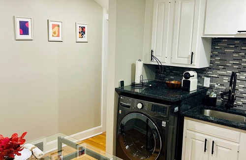 Unique, modern studio attached to a single-family home in Belmont. Ideal for professionals, with excellent commutes to Boston/Cambridge universities, hospitals, and biotech hubs. Private entrance, optional garage, queen bed, sleeper sofa, TV, WIFI. Fully equipped kitchen with washer/dryer (no oven). Bright bathroom with rainforest shower. Enjoy parks nearby and a shared fenced backyard for relaxation.