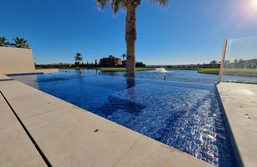 Prachtige villa, heel rustig gelegen in de golf, vlakbij padel en 10 km van de zee. De hoofdslaapkamer heeft een bubbelbad. Alles is voorzien van rolluiken om goed te slapen. Eveneens is alles voor 1 baby voorzien . De kunst is van mij gemaakt . Zalig om van zonsondergang te genieten daar met prachtig uitzicht