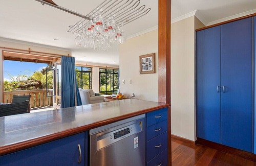 Nestled in the treetops, you'll feel as though you're staying in a fairytale tree house come to life. The punga trees and native bush offer privacy and a haven for birds to visit. Enjoy your morning coffee on the expansive wraparound deck as you gaze out over the bush towards sparkling Lake Taupo.