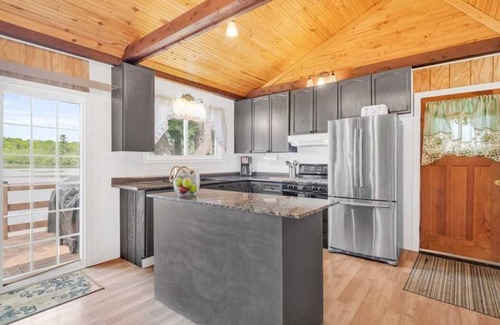 Inside the open-concept lakeside cottage, find respite with air conditioning, a gas fireplace, and all the amenities for life's simple pleasures. The well-equipped kitchen, cozy bedrooms, and comfortable living spaces cater to your every need.