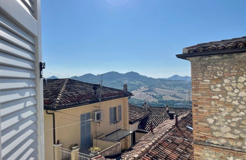 From the wide-open windows on terracotta roofs and endless hills, a gentle light enters this well-kept and quiet studio apartment. You are in the heart of Verucchio, in a nest designed for two, where design and quiet meet.