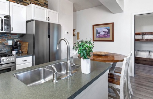 Step inside and experience the spacious accommodations of The Mason at Stillwater 3070. The condo features two private bedrooms designed with relaxation and convenience in mind. The master bedroom is a tranquil retreat with a plush king-sized bed and an en suite bathroom, offering privacy and comfort. The second bedroom is perfect for families and groups, featuring a unique full-over-queen bunk bed with a twin trundle and its own private bathroom. For additional guests, a luxury, self-inflatable queen air bed is available, ensuring everyone has a comfortable place to rest.