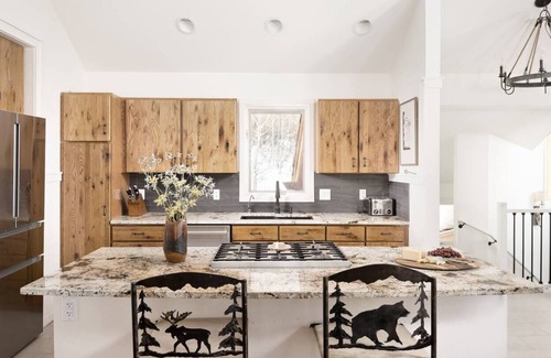 The house has three fireplaces, three decks, three smart TVs, and a built-in sound system. A second living room includes a large kitchenette for entertaining with a pass-through bar window to the deck. Perfect for parties and entertaining. Sunlight Mountain House boasts all-new appliances, ensuring modern comfort and functionality throughout your stay.