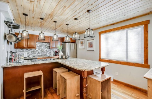 Our mountain modern cozy condo with views of the mountains in East Vail is steps away from the free Vail Shuttle that leads into the heart of town/lifts. This newly remodeled two bedroom features a beautiful kitchen, living room, and dining area. Flat-screen TV includes streaming services, free WiFi, and Free parking. The condo is surrounded by bike trails, hiking trailheads, and Gore Creek. Down the street are multi million dollar mansions at the base of the mountain and along the creek.