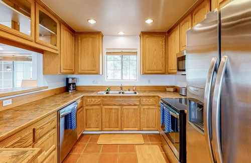Furnished for comfort, the single-level interior features a bright, open layout equipped with all the home essentials for modern living. The full kitchen includes a suite of stainless steel appliances and a handy supply of cookware and serving utensils for planning at-home meals and there's seating for the whole family at the dining table set for six. After the day's activities, unwind in the living room with shows and movies on the smart or choose from one of the available board games for some old-school entertainment. A gas fireplace adds a touch of cozy ambiance for group gatherings. Additional perks include central air-conditioning, free WiFi, and a private washer/dryer combo.