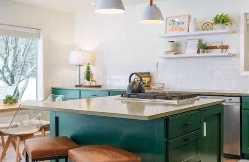 No details were spared when outfitting The Warming Hut and we feel confident that you will find everything you need to make your stay feel like a home away from home. The spacious kitchen has modern appliances, garbage disposal, gas stovetop and all the kitchen gadgets and cooking essentials ( flour, sugar, spices, etc) you will need will make cooking in delightful (even while on vacation). Help yourself to coffee, keurig pods, tea or hot chocolate provided for you. Two dining areas and a island bar give ample seating options for your entire party.