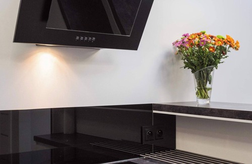 Induction hob, oven, dishwasher, toaster, steam extractor, capsule coffee maker, fridge, freezer, electric kettle, microwave, wine glasses.
