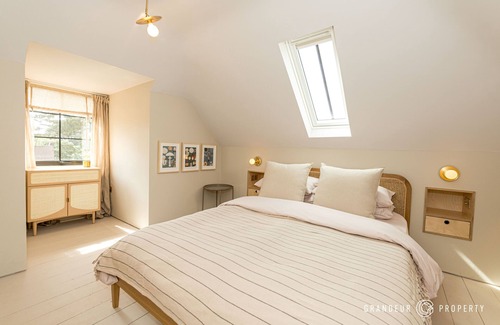 An oversize Velux window streams natural light into this gorgeous second bedroom, located on the first floor. Neutral tones continue into this room, making it a perfect retreat at the end of a busy day at the beach.