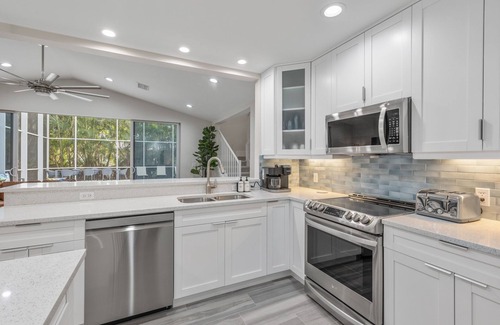 The house is 2-stories and has been professionally decorated and designed. The combination of the double lot and numerous windows allow ample, natural light, into the home. Upon entering the home you will be greeted with a small foyer to kick off your shoes and make yourself at home. The open floor plan greets you right around the corner with an open kitchen, dining , and living room. There is a large 65” Samsung 4k HD Smart TV in the living room for your use. You might even be inspired to cook after dining out in Naples using the fully stocked kitchen with utensils and cookware if you would like to prepare a meal yourself. The large dining table has plenty of space to enjoy a group meal with seating for 8, and 4 barstools at the large island. After dinner, enjoy your private oasis, wind down, and relax in the large covered lanai by the pool.