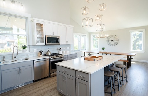 Upper Floor - Fully stocked kitchen with island; Dining Room with long table; Great Room; Deck with BBQ grill and outdoor table; balcony with views to the ocean; sitting loft with large view window facing ocean - perfect for the morning coffee time or afternoon read. Two Bedrooms are on this floor: one King and one double Queen.