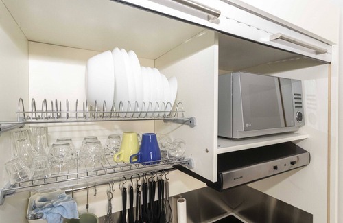 The kitchen is equipped with an oven, a stovetop, and a refrigerator, as well as a coffee maker, a microwave, and cookware. Bathroom amenities include a hair dryer, a bidet, and towels. And because there's a washing machine, you can go a bit lighter on your packing.