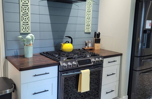 *Fully stocked kitchen with gas range, pots & pans, baking sheets, muffin tin, bowls, hand mixer, toaster, cooking utensils, basic spices/cooking sprays, cutting boards, blender, knife block, coffee station (Keurig, 12-cup drip coffee maker, Keurig pods, creamers and sweeteners) and everything you need to prepare a great meal! We love to cook so made sure we provided everything we would want if we were preparing a meal. Paper towels and hand & dish soap provided.