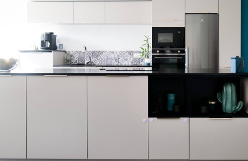 Open kitchen: refrigerator, freezer, oven, microwave, kettle, toaster, dishwasher, Krups coffee maker and numerous storage spaces.