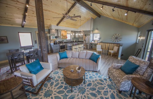 New house with chic farmhouse vibe. Has 2 king bedrooms and a queen bedroom. 2 full baths and a quarter bath off living room. Features hot tub, grill, outdoor dining, trailer parking, and paved roads for ease of access.