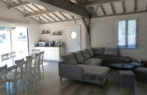 New single-story timber-frame house with private pool - Sleeps 10 - 118 m² including a living/dining room/kitchen (stove not allowed) - one bedroom with a 140 cm bed - one bedroom with a 140 cm bed - one bedroom with a 140 cm bed - one bedroom with a 90 cm bed, two 90 cm bunk beds, a sofa bed - one bedroom with a 160 cm bed and its bathroom with shower, double sinks, and drawers - one bathroom with toilet - a separate toilet with washbasin - gas stove, oven, microwave, dishwasher, fridge/freezer combination, classic coffee maker + Senseo coffee maker, washing machine, television, free Wi-Fi, Complete baby equipment: crib, high chair, bathtub, changing mat, and deckchair. Enclosed garden with a 6m x 3m heated pool, 1.45m deep, with 4 sun loungers, garden furniture, parasol, and barbecue. Parking on the property. Pets not allowed. A cleaning fee of €195 is available.
