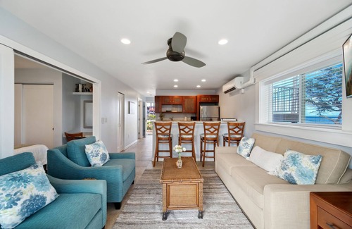 Enjoy the convenience of a fully equipped kitchen with granite countertops and stainless steel appliances, including a microwave, stove, fridge, and dishwasher. Start your day on the spacious private lanai or enjoy a meal at the breakfast bar with seating for four. The living area offers a comfortable sofa and a Smart TV where you can stream your favorite apps. Additional amenities include air conditioning in the living room, a stacked washer/dryer, reserved parking, and complimentary Wi-Fi. We also provide beach gear, including towels, chairs, an umbrella, and a cooler.