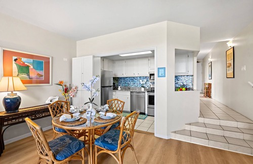 Inside, the condo is designed for comfort and convenience. The living room features a 65" Smart Roku TV, a sofa sleeper, and a dining area, while the fully equipped kitchen has new stainless-steel appliances, an ice maker, filtered water, and all the essentials for preparing meals at home. The bedroom includes a queen bed with Japanese Shoji-style sliding doors for privacy and a 40" Smart Roku TV. The bathroom was fully remodeled in 2020, and for added convenience, there is an in-unit washer and dryer. From the moment you enter the front door, the ocean is in view, creating a true paradise experience.