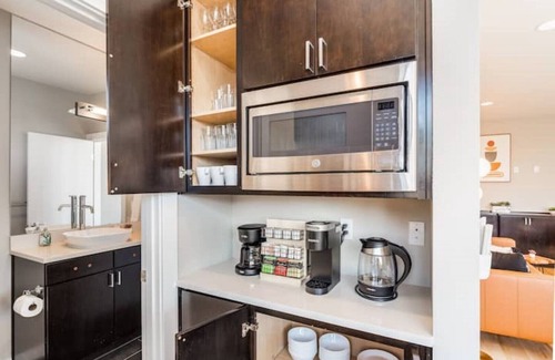 - Fully-stocked kitchen with Keurig K-cup coffee maker and coffee cups, pans, bowls, plates, glasses and utensils