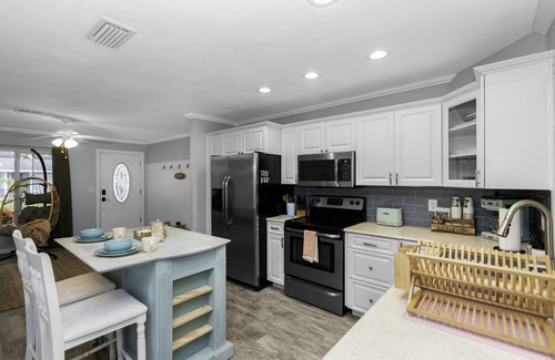 Relax and read a book in our cozy living room swing chair. Enjoy your host provided local ground organic coffee or organic tea at our coastal cool kitchen island, while taking in the views of the beautiful palm trees or listening to the tranquil sound of the pool waterfall. The open layout is perfect for family gatherings and dining. Enjoy family movie night on the large screen TV, while relaxing on the large sectional sofa in the second living room, or take out some provided playing cards and board games for a little friendly competition!