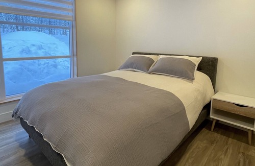 The cottage will comfortably accommodate eight people. On the lower level, you’ll find an open space floor plan with a modern kitchen boasting stainless steel appliances, including a wine fridge and induction oven, a dining area for eight and a cozy living area to enjoy our unique Stuv fireplace. This is also where the three bedrooms are located (two Queen and one bunk bed), as well as a full bathroom, featuring a modern shower, washer and dryer. The second floor has a big sectional and a 75” Smart TV - this is where you can watch movies, play board games, have a karaoke night, enjoying the beautiful views. The sectional has a built-in queen sofa bed and there is another full bathroom on this level.
