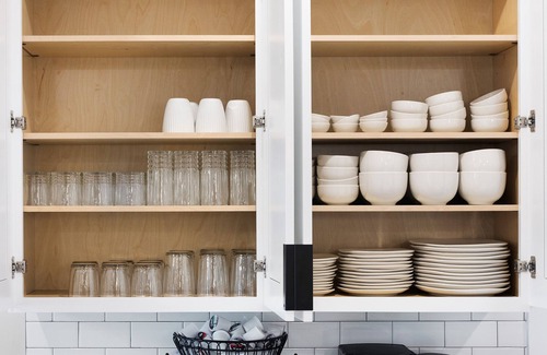 -Kitchen fully equipped for a chef including pots, pans, chef knives, cooking utensils, chopping boards, mixing bowls, baking sheets, cheese knives, glassware, utensils and full place settings for 12.