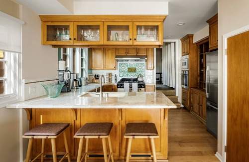 The kitchen is fully equipped with high-end appliances, including a Viking oven range,a Miele convection oven, a Fisher & Paykel refrigerator, a two-drawer dishwasher, microwave, French press, pour-over coffee station, wine fridge, toaster, blender, and electric kettle. Whether you`re cooking in or bringing food home, this space was designed for functionality and flow.