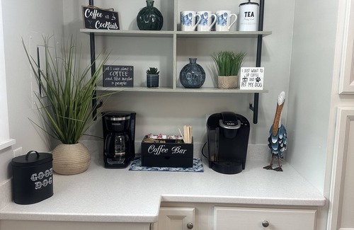 The well appointed kitchen boasts a large quartz island with seating, great for both meal prepping and family gatherings. Coffee lovers will love the well stocked coffee bar including a Keurig. The kitchen feeds into the beautifully decorated living room with plenty of seating and a 75” tv for family movie nights. Step down into the den area where you can converse at the game table or sit sipping your favorite drink at the bar or just relax and read a book.