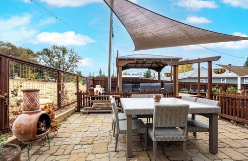 Charming 1940s home in the heart of Murphys! A short walk to local wineries, dining & shops, the home blends vintage charm with modern comfort. Inside, find an oversized couch, 65" TV, fully equipped kitchen & games for all. Outside, enjoy breathtaking views from the big gazebo, gather around the fire pit, or enjoy a game of cornhole or darts. With lots of room for your group, the home is perfect for fun, meals, & relaxing after a day of fun or outdoor activities - many just a short drive away.