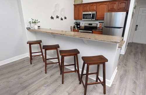 Walk on into the condo and you will pass through the kitchen that has new fresh paint and gourmet amenities including a new dual coffee maker so you can choose to use pods or make yourself a pot of coffee. Getting in late? No worries, there will be a couple of pods to get you through the next morning while sitting on the spacious balcony and listening to the waves come crashing in. It is also equipped with a dishwasher, stove, washer/dryer and new pots/pans, mixing bowls and silverware for you to make your own meals if you so choose.