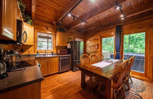 Cabin has the comforts of home with a full service kitchen including dishwasher, refrigerator with automatic ice-maker, a washer/dryer, gas fireplace, Brand New Stainless Steel gas grill, New fire pit with an open flame grill, and a 7-person outdoor hot tub.