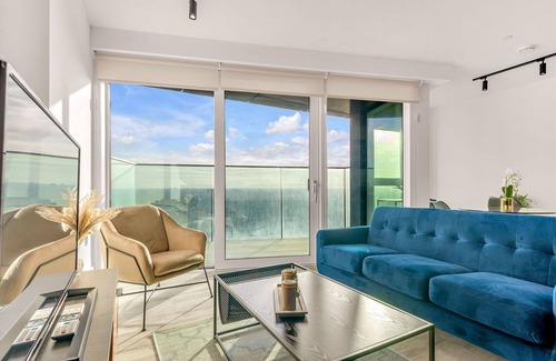 The property is a 2-room apartment suitable for 2 adults, featuring a spacious, modern, and stylish design. It consists of an open living/dining room area with a TV (flat screen), one double bedroom with a double bed, and an open kitchen. The kitchen is equipped with an oven, dishwasher, 4 ceramic glass hob hotplates, toaster, kettle, microwave, and freezer, as well as a dining table.