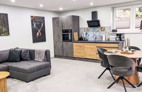 "Am Waldrand", 2-room apartment 50 m2, lower ground floor. Fully renovated in 2024, modern and tasteful furnishings: living/dining room with dining table and cable TV (flat screen). Exit to the terrace. 1 room with 1 double bed (180 cm, length 200 cm), cable TV (flat screen). Open kitchen (oven, dishwasher, 4 ceramic glass hob hotplates, toaster, kettle, freezer, electric coffee machine). Shower/WC. Oil heating, underfloor heating. Terrace 20 m2. Terrace furniture, barbecue. Facilities: washing machine, dryer. Internet (WiFi, free). Please note: non-smokers only. Maximum 1 pet/ dog allowed. Private entrance, smoke alarm.
