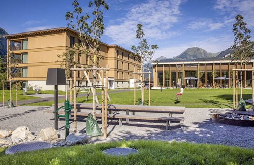 The "SWISSPEAK Resorts Meiringen" is a modern, child-friendly resort located in the heart of Meiringen, Switzerland, just 600 meters above sea level. Built in 2019, this four-story complex comprises 6 houses and 79 apartments within the residence. The resort boasts a range of amenities such as a park with plants, a meadow, a children's playground, a reception area, a lounge, WiFi, a sauna, a relaxation room, a playroom, a lift, storage rooms for bicycles and skis, a central heating system, and laundry facilities (extra charge). You can enjoy a yard, in-village location, internet WiFi, parking (limited spaces, extra charge), a tennis court, an EV charging station, and the option of an installment plan.