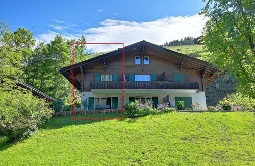 The chalet is conveniently located near various facilities and attractions. Nearby is the Hotel Simmenhof, which offers a spa, indoor and outdoor pool, sauna, ice cave, and a good restaurant. A shopping center (Landi) is approximately a 7-minute walk away. The bus stop for the shuttle is just across the street, and the "Boden" train station is also very close. The rental includes current, heat, garage, cleaning upon departure, sheets, toilet towels, and tax. However, a fee of CHF 50.00 per dog is charged by the owner, with a maximum of two dogs allowed (just an example).
